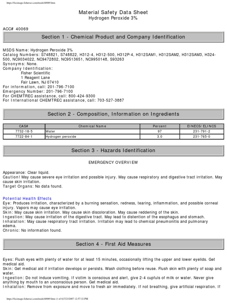 Hydrogen peroxide, a component of this product, is on the tsca inventory and cercla/sara. Safety data sheet hydrogen peroxide 3% first priority, inc. Osha, cma, ansi, canadian whmis standards,. Page 1 of 7 prepared to u.s. Hydrogen peroxide, 3% w/w safety data sheet 2012 / rules and regulations issue date: