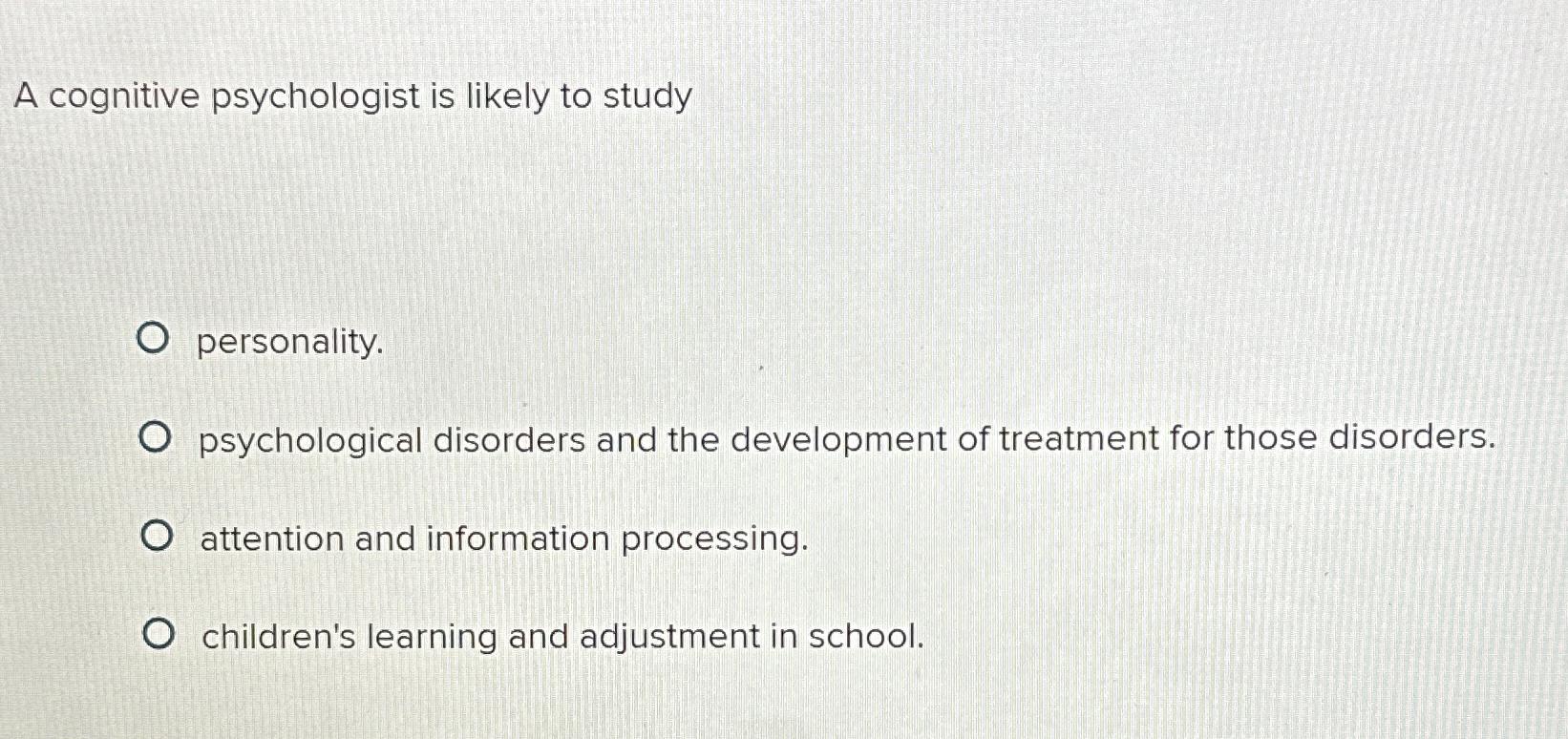 Cognitive psychologists are most likely to study. Study with quizlet and memorize flashcards containing terms like a cognitive psychologist is least likely to study whether ____., the. Psychology should study how culture and beliefs impact an individual. Study with quizlet and memorize flashcards containing terms like which of the following is a cognitive psychologist most likely to study?,. Cognitive psychology.