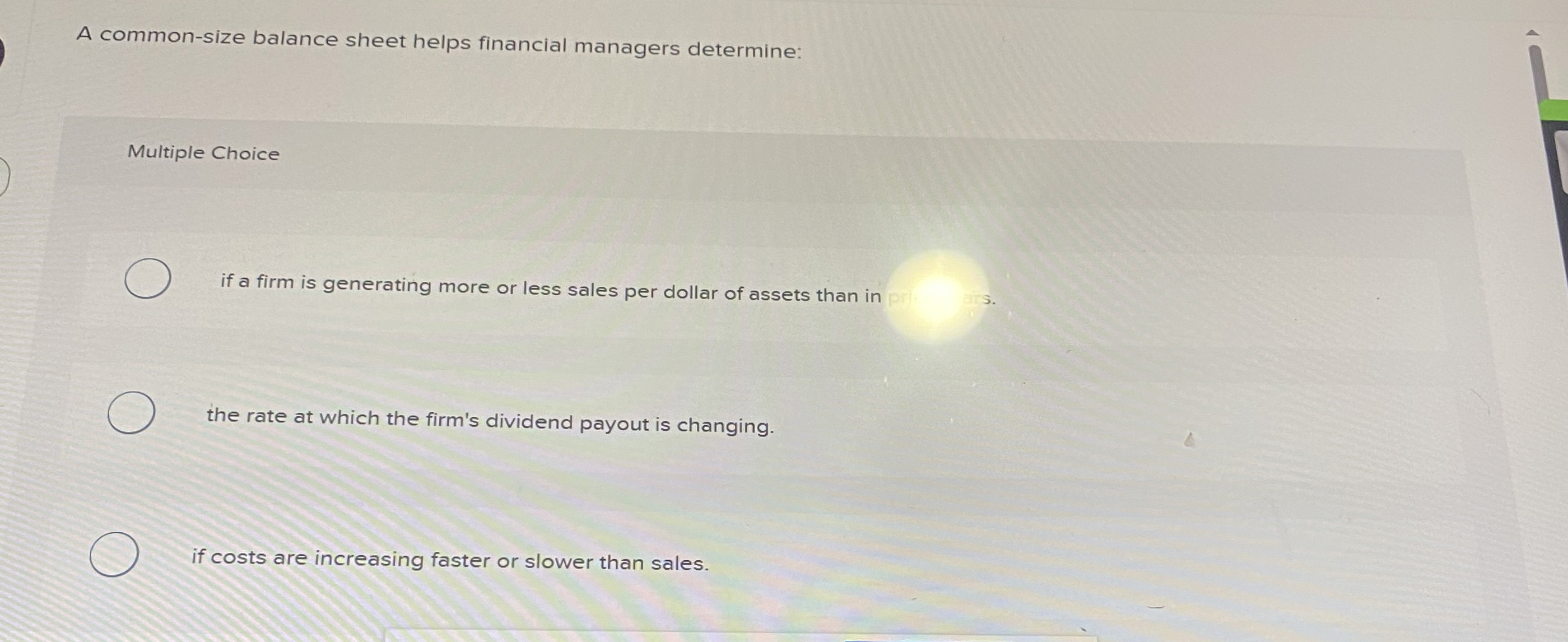 A Common Size Balance Sheet Helps Financial Managers Determine - Which customers are paying on a timely basis. If costs are increasing faster or slower than sales. If a firm is generating. B) if a firm is. A) the rate at which the firm's dividends are changing. Which customers are paying on a timely basis. Which customers are paying on a timely basis. Not the question you’re looking for? Here’s the best way to solve it.