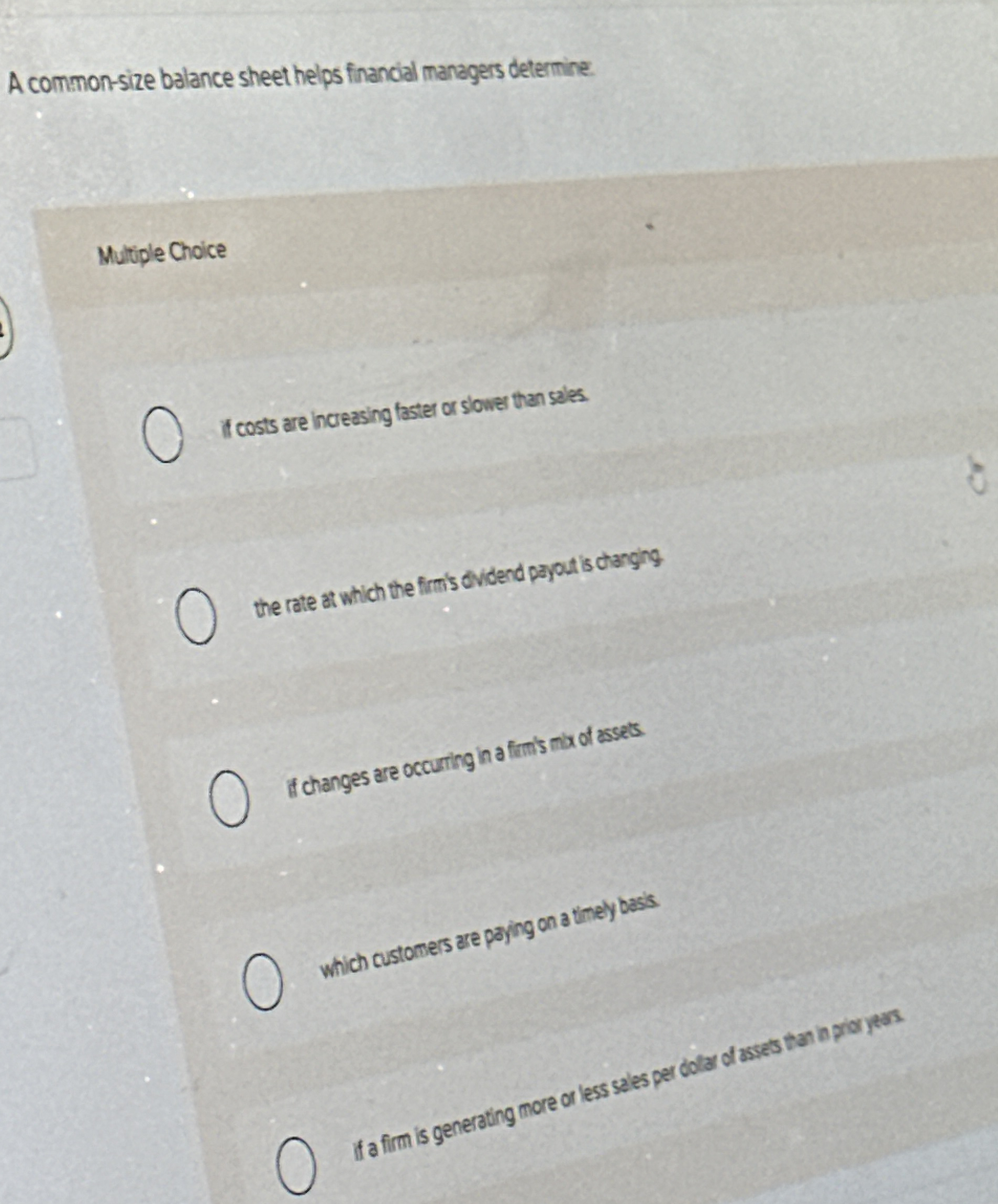 Here’s the best way to solve it. Which customers are paying on a timely basis. B) if a firm is. If costs are increasing faster or slower than sales. A) the rate at which the firm's dividends are changing.