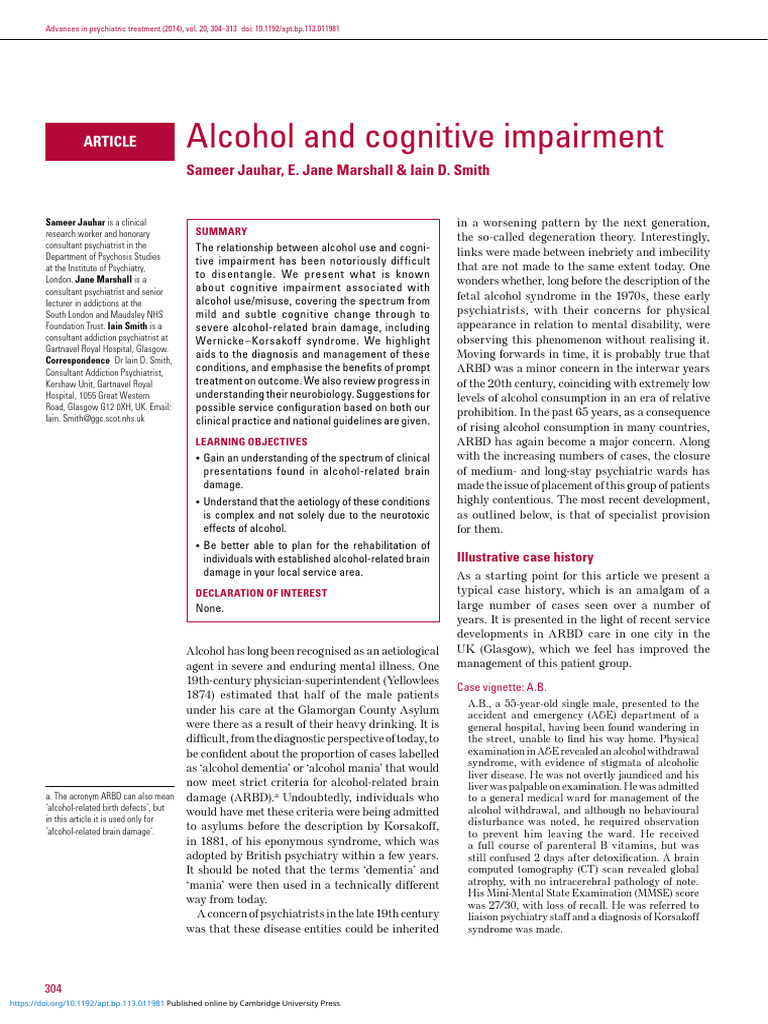 Evidence suggests a correlation between alcohol use and cognitive decline. Lingering and accruing untoward consequences of alcohol use disorders (also referred to as chronic alcoholism and alcohol dependence and abuse). Theoretical models of impaired cognition are intended to explain. People with alcoholism express cognitive deficits of varying type and severity. We have systematically reviewed the concept and.