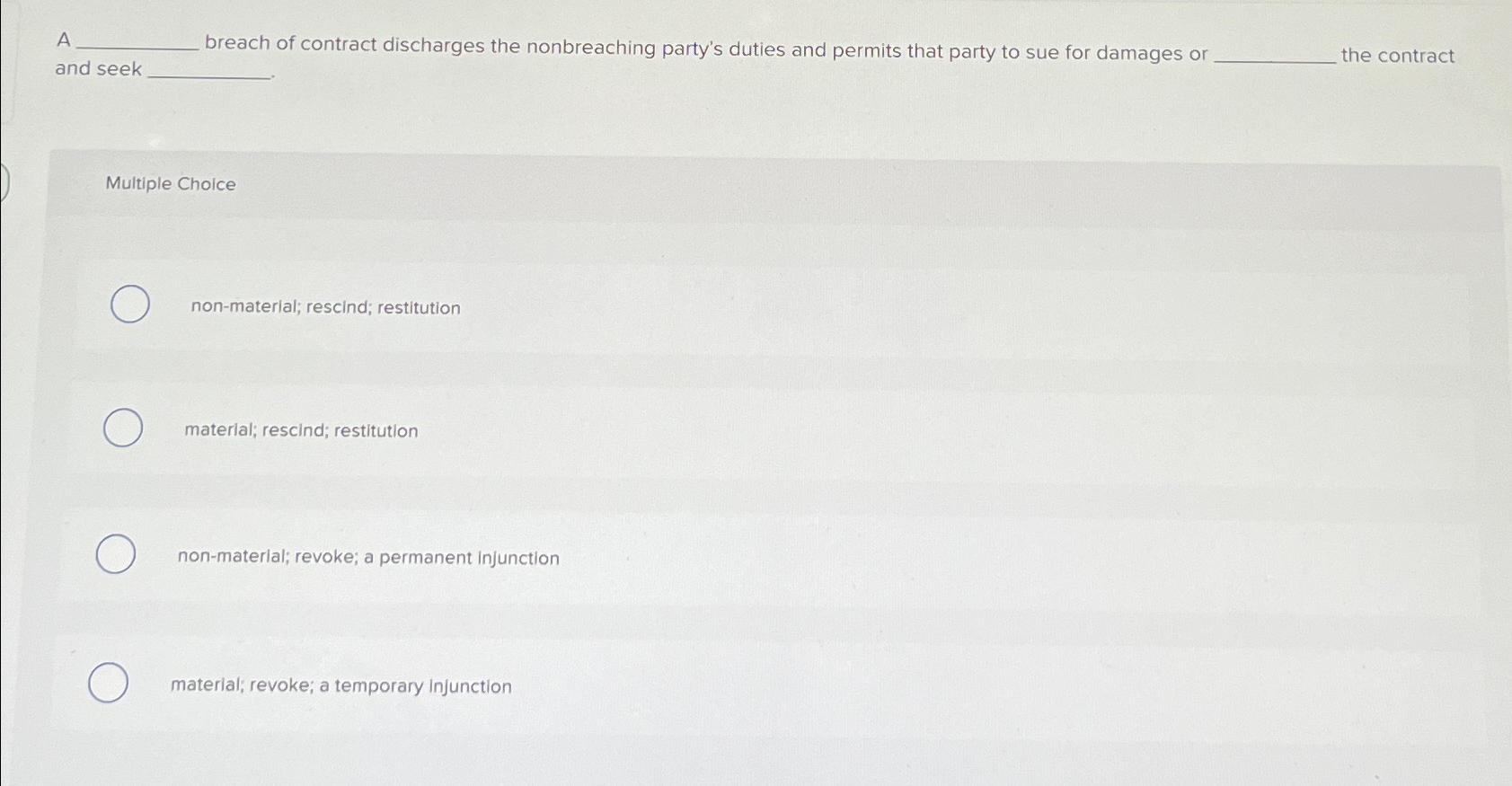 Contracts can be discharged by performance: (t/f) any breach discharges the nonbreaching party from the contract. A material breach of contract (which occurs when performance is not at least substantial) excuses the nonbreaching party from performance of his. False (t/f) after a contract is made, a supervening event may. In those jurisdictions, any breach discharges the nonbreaching party from the.