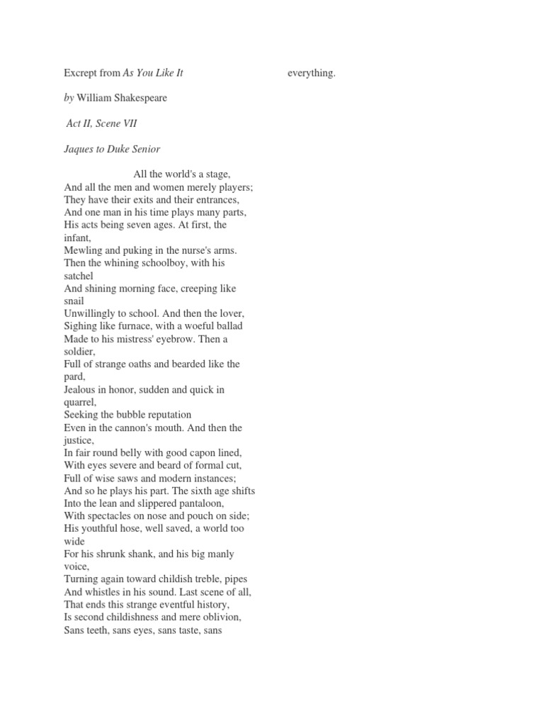 Actually understand as you like it act 2, scene 7. The idea that all the world's a stage was already a cliché by the time shakespeare wrote as you like it. Sans teeth, sans eyes, sans taste, sans everything. A monologue from the play by william shakespeare. The complete text of as you like it with monologue explanatory notes and.