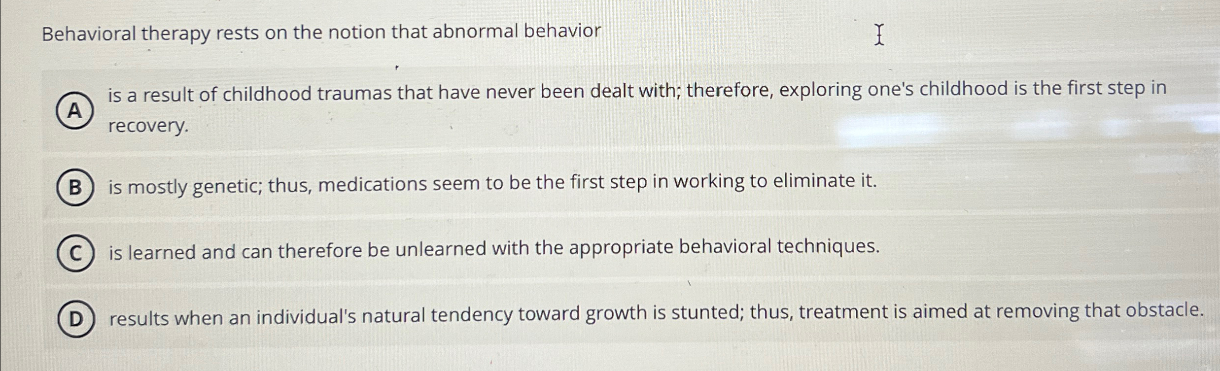 In Regard To Behavioral Therapy, The Fundamental Notion Is That Abnormal Behavior Is Something That Is Learned Through Conditioning.