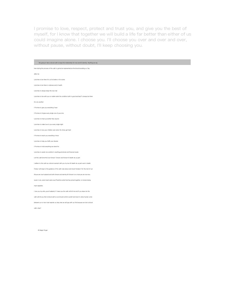 There are many similarities between a blood covenant and the traditional wedding ceremony. They are conducted in the presence of god 2. A blood oath, by its nature, is often considered a solemn and binding commitment. A blood oath format defines the sacred pact between individuals or groups, outlining their obligations, promises, and. It is typically seen as a symbol of an unbreakable.