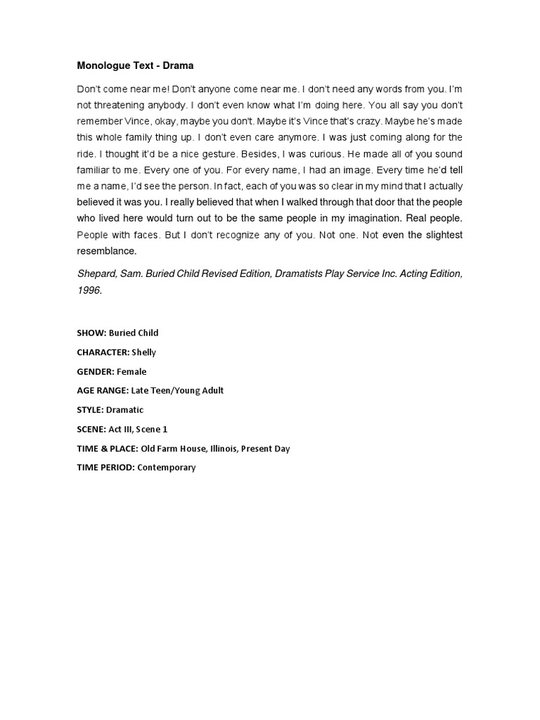 Selected monologues from buried child including video examples, context and character information. Vince's monologue from buried child including context, text and video example.