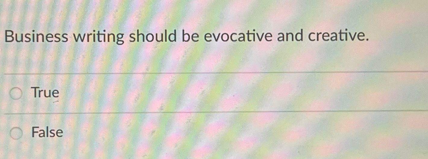Business Writing Should Be Evocative And Creative - Study with quizlet and memorize flashcards containing terms like business writing should be evocative and creative., what is the preparation.