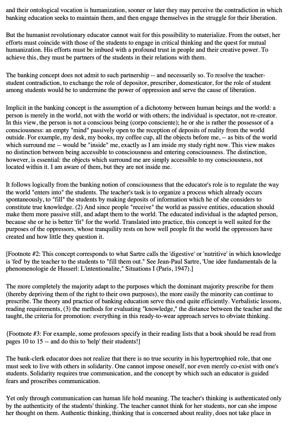 He criticizes the traditional banking method, in which students memorize. Now, what does it mean to educate? What does it mean to be an educator? Projecting an absolute ignorance onto others, a characteristic of the ideology of oppression, negates education and knowledge as processes. Chapter two opens with the claim that education suffers from “narration sickness”—wherein teachers treat their students.