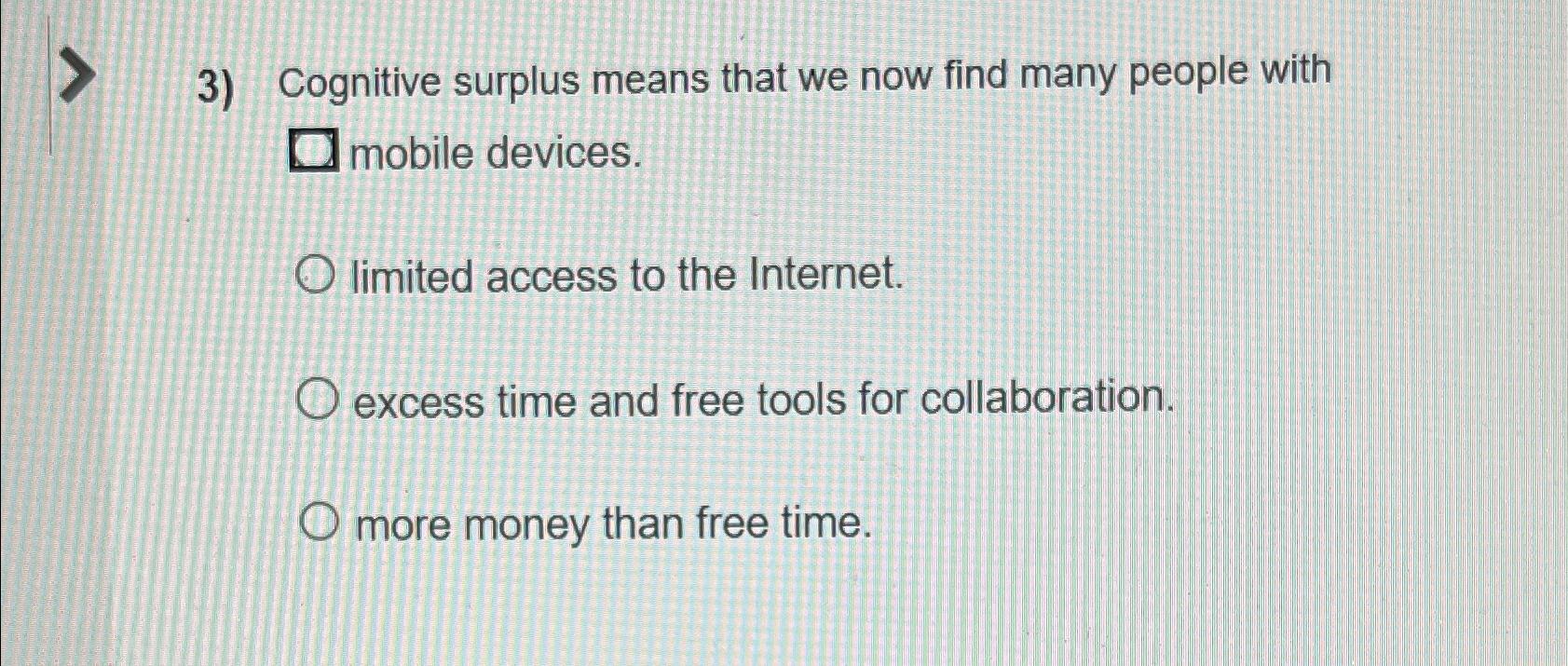 Cognitive surplus means that we now find many people with a. A set of flashcards for reviewing the concepts and terms from chapter 1 of a textbook on technology and society. One card asks about cognitive. More money than free time. Limited access to the internet.
