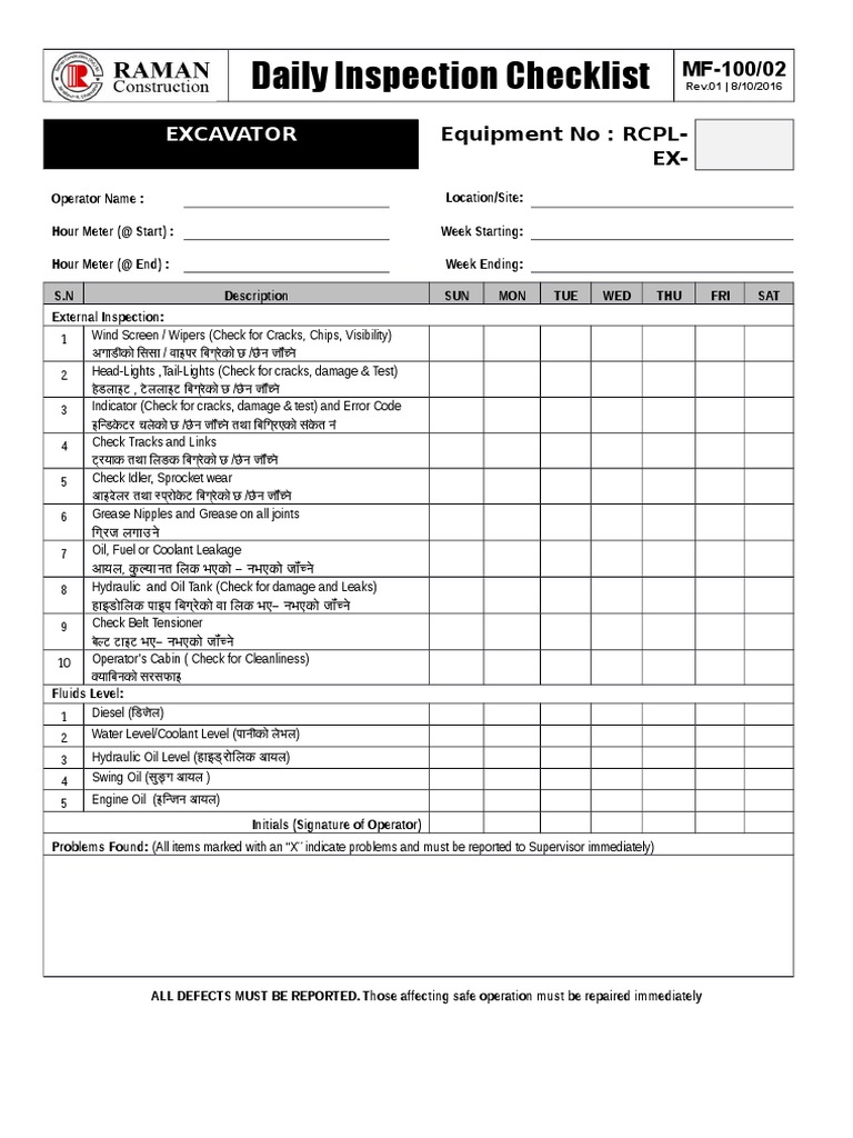 Daily Inspection Checklist For Excavator