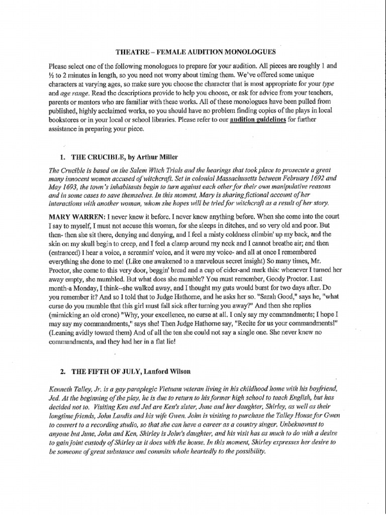 Contemporary Female Monologues Pdf - Monologues for women from plays which were. Find comedic and dramatic monologues for.