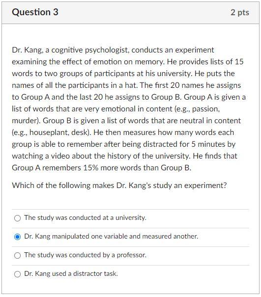 Solved Question 3 2 pts Dr. Kang, a cognitive psychologist,