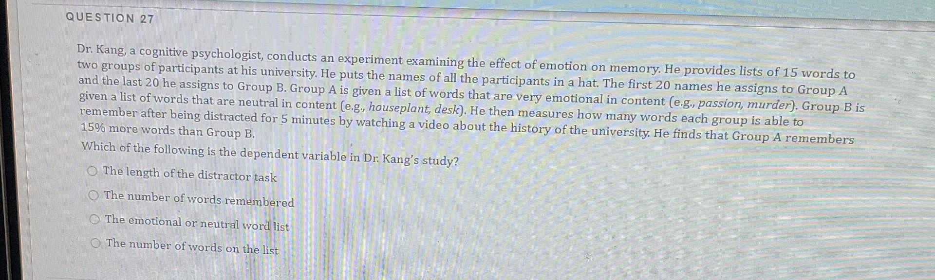 Study with quizlet and memorize flashcards containing terms like dr. Kang, a cognitive psychologist, conducts an experiment examining the effect of emotion on memory. To succeed in this class you have. He provides lists of 15 words to two. Kang, a cognitive psychologist, conducts an experiment.