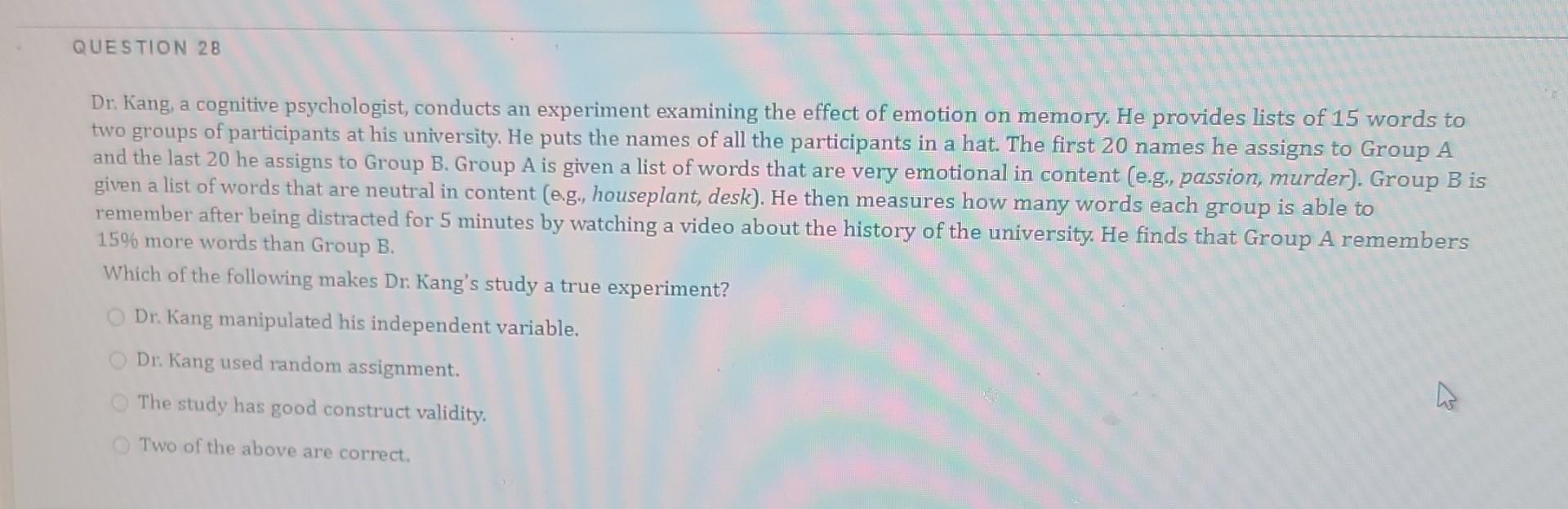Study with quizlet and memorize flashcards containing terms like dr. Kang, a cognitive psychologist, conducts an experiment examining the effect of emotion on memory. Kang, a cognitive psychologist, conducts an experiment. To succeed in this class you have. He made the course engaging and interactive.