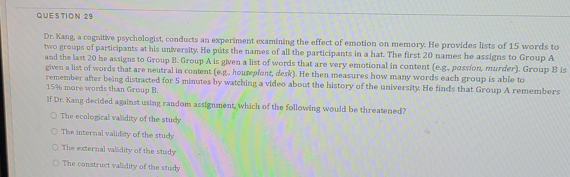 Kang, a cognitive psychologist, conducts an experiment. Study with quizlet and memorize flashcards containing terms like dr. Kang, a cognitive psychologist, conducts an experiment examining the effect of emotion on memory. Kang, a cognitive psychologist, conducts an experiment examining the effect of emotion on memory.