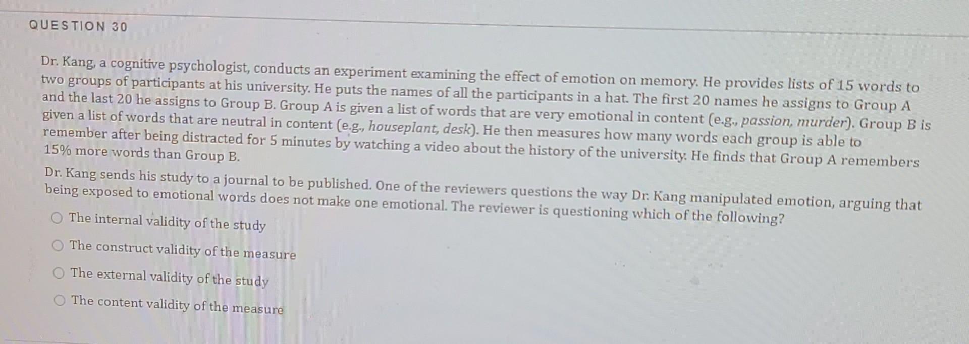 Solved QUESTION 30 Dr. Kang, a cognitive psychologist,