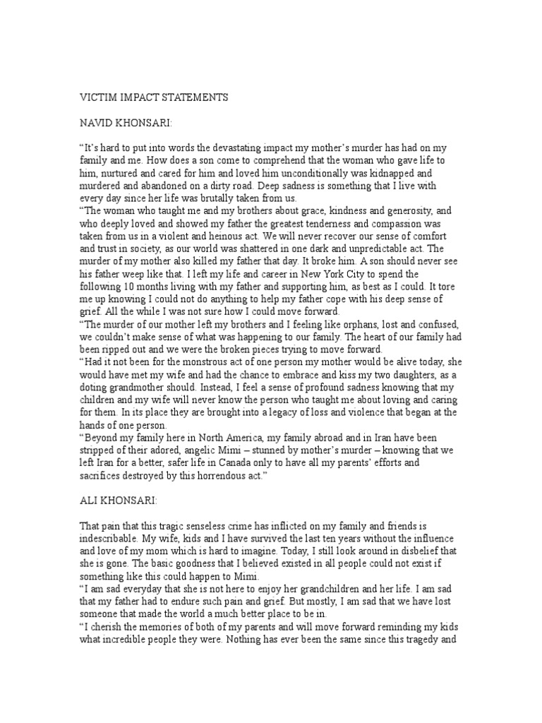 Written victim impact statements can be in a variety of different formats, depending on what feels most comfortable for the victim. He slammed my back over the top of my chain link fence over. Examples of victim impact statements can be potent tools that express the personal and emotional aftermath experienced. Describe the ways the crime has impacted your life.