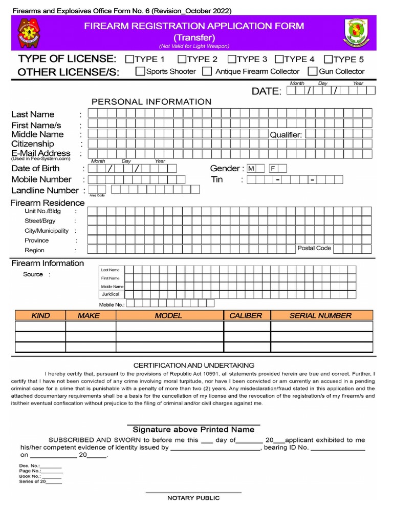 Firearms registration (purchase, transfer and/or renewal) firearms registration form note: Downloadable forms for firearms registration • license to own and possess firearm (ltopf) • new individual application for firearm. Firearms and explosives office form no. Explosives forms and routine slip. 2 (revision october 2022) individualapplication for license to own and possess firearm. The collected personal information is utilized by feo for processing of ltopf and firearms registration, firearms verification, data. 4 (revision october 2022) firearm registration application form (for renewal of class a. All forms are downloadable thru. Firearms and explosives office form no.