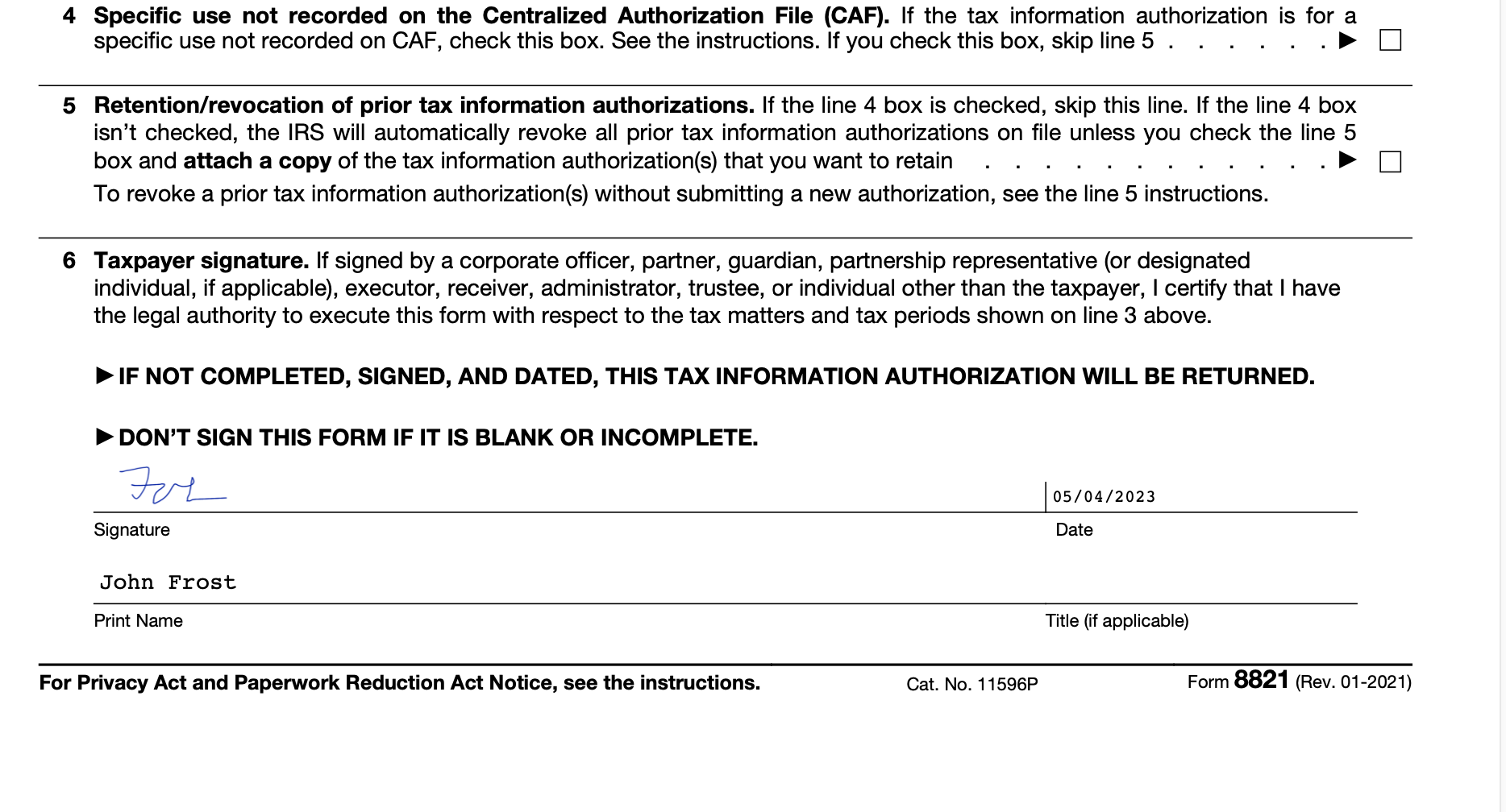 Go to www.irs.gov/form8821 for instructions and the latest information. Form 8821 authorizes any individual, corporation, firm, organization, or partnership you designate to inspect and/or receive your confidential information for the type of tax and the years or. Don’t sign this form unless all applicable lines have been completed. Don’t use form 8821 to request copies of your tax. Don’t sign.