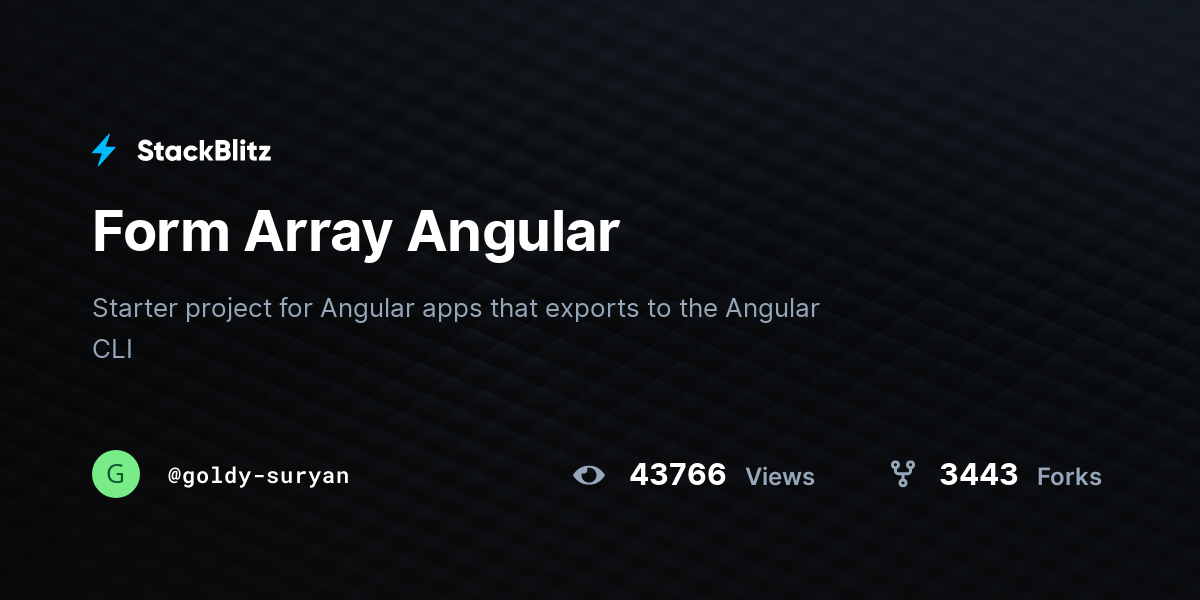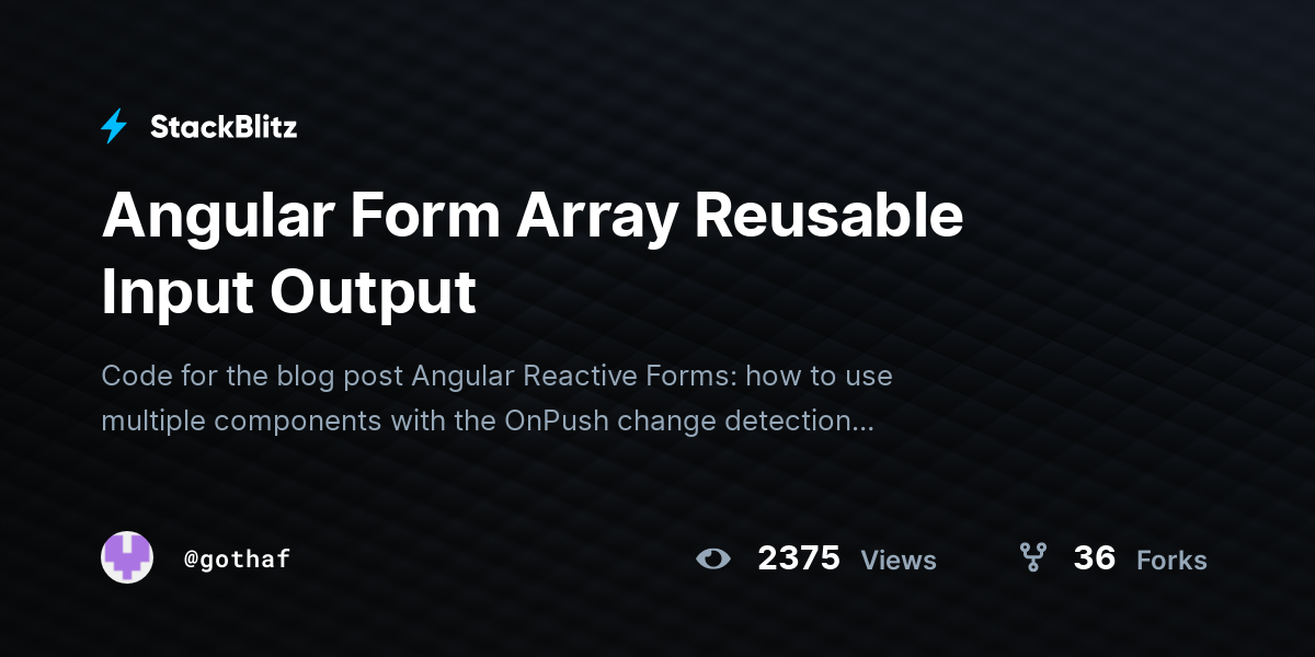 Form Array In Angular Stackblitz - How to use multiple components with the onpush change detection. Starter project for angular apps that exports to the angular cli. Starter project for angular apps that exports to the angular cli. Starter project for angular apps that exports to the angular cli Createform() { this.heroform = this.fb.group({ name: Angular form array sample code for the blog post angular reactive forms: