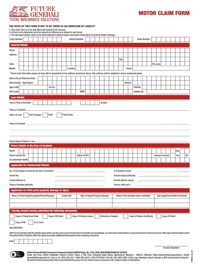Future Generali MotorOd Claim Form PDF Insurance Driver's License