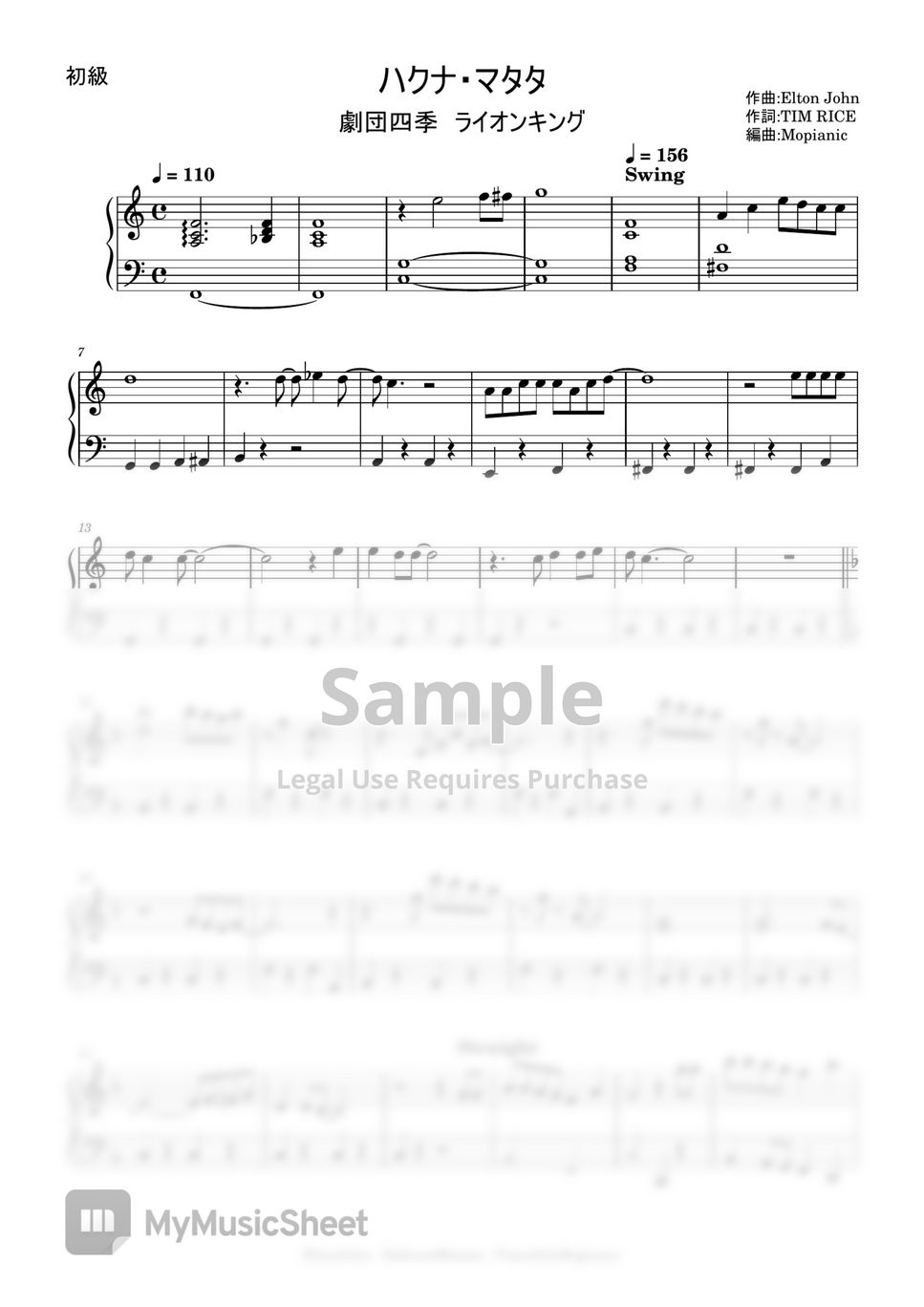 Elton John Hakuna Matata (beginner, piano) Sheets by Mopianic