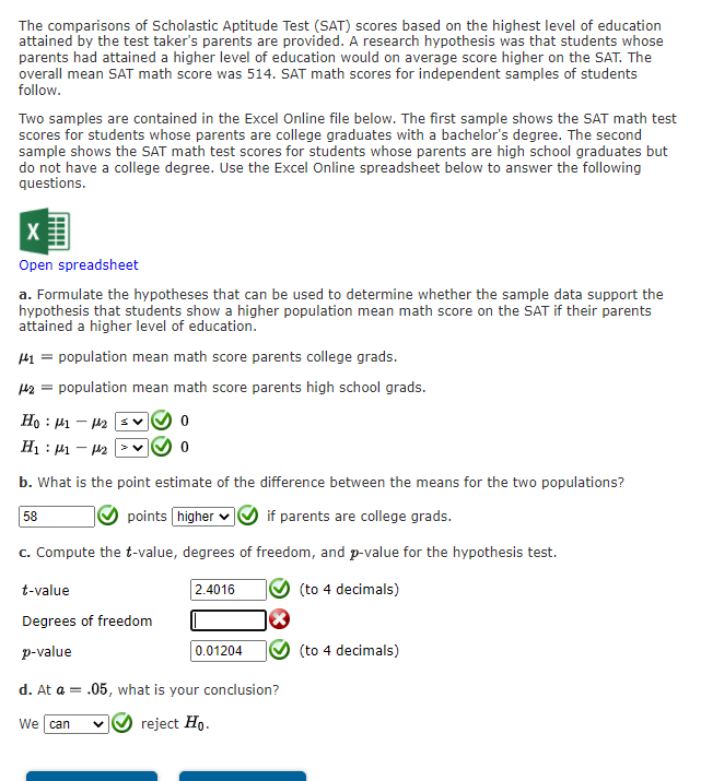 Solved The comparisons of Scholastic Aptitude Test (SAT)
