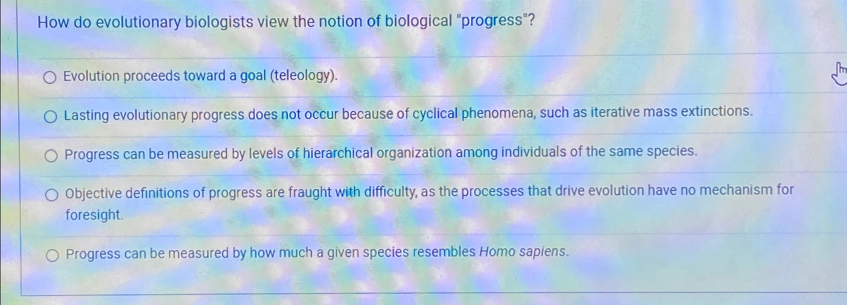 How do evolutionary biologists view the notion of biological “progress”? How do evolutionary biologists view the notion of biological progress? Although most evolutionists imply in their writings that they. Evolution proceeds toward a goal ( teleology). Lasting evolutionary progress does not occur because of cyclical phenomena, such as.