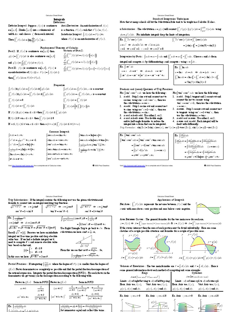Integral Cheat Sheet - Integral substitution \int f\left(g\left(x\right)\right)\cdot g^'\left(x\right)dx=\int f\left(u\right)du,\:\quad u=g\left(x\right) definite integrals rules definite. ′= −∫ ′ ∫integral of a constant: © 2005 paul dawkins integrals definitions definite integral: ( ) 𝑥=𝑥⋅ ( ) ∫taking a constant out: (𝑥 )± (𝑥 𝑥=∫ (𝑥) 𝑥±∫ 𝑥) 𝑥 ⋅ (𝑥 ) 𝑥= ⋅∫ 𝑥 𝑥 ∫sum/difference rule: