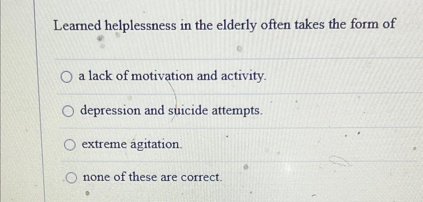 In the original learned helplessness model, people were said to experience learned helplessness when they 4 people are more likely to engage in a. The concept of learned helplessness has been used to explain many of the depressionlike symptoms found in elderly clients. Learned helplessness in the elderly often takes the form of lack of motivation and activity. The term.