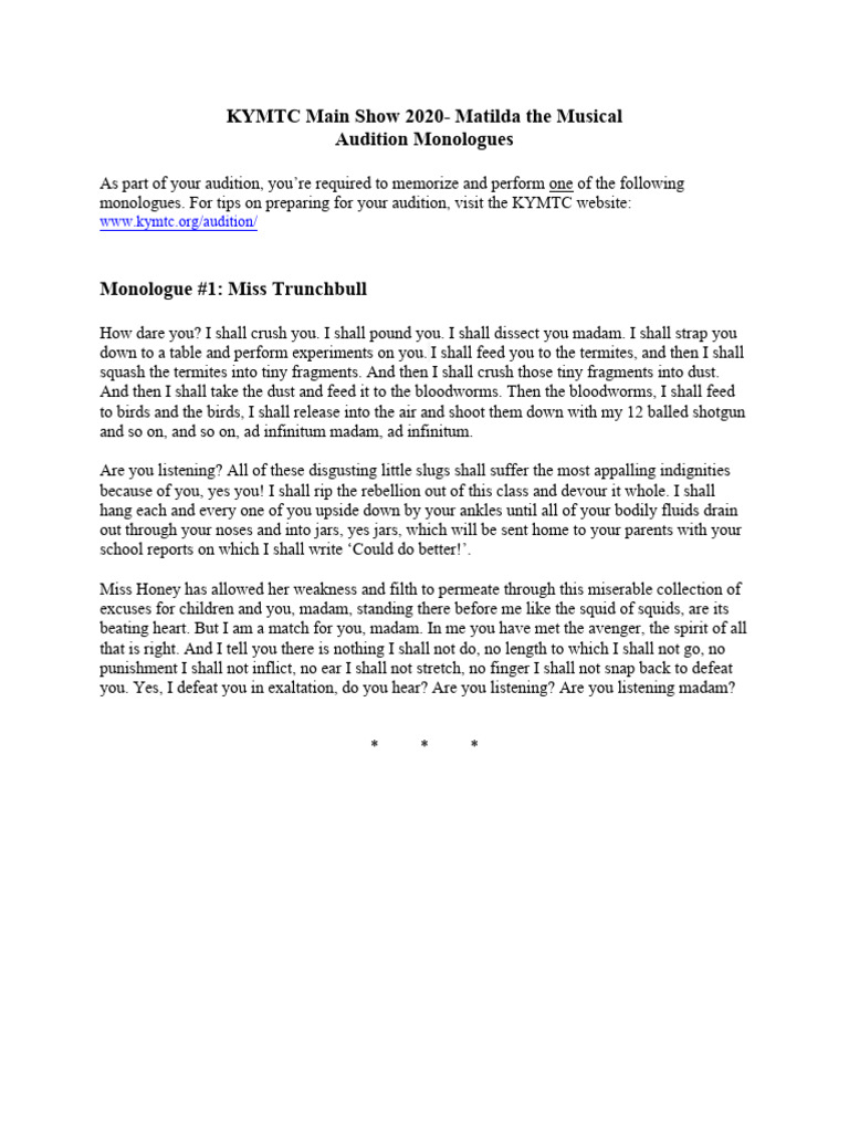 Performers are asked to prepare the monologue for whom they are auditioning. It helps us better see your acting abilities! Matilda monologues miss trunchbull sometimes in life, horrible and unexplainable things happen. These things are a test of character. I would highly recommend memorizing your monologue for your audition.