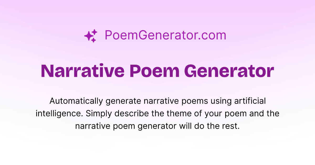 Create a narrative poem through our generator with the following steps: Generate captivating narrative poems with our narrative poem generator. Create captivating narrative poems with this dynamic tool that merges storytelling with poetic elegance. Craft compelling stories through expressive, narrative poetry. Explore a collection of enchanting.
