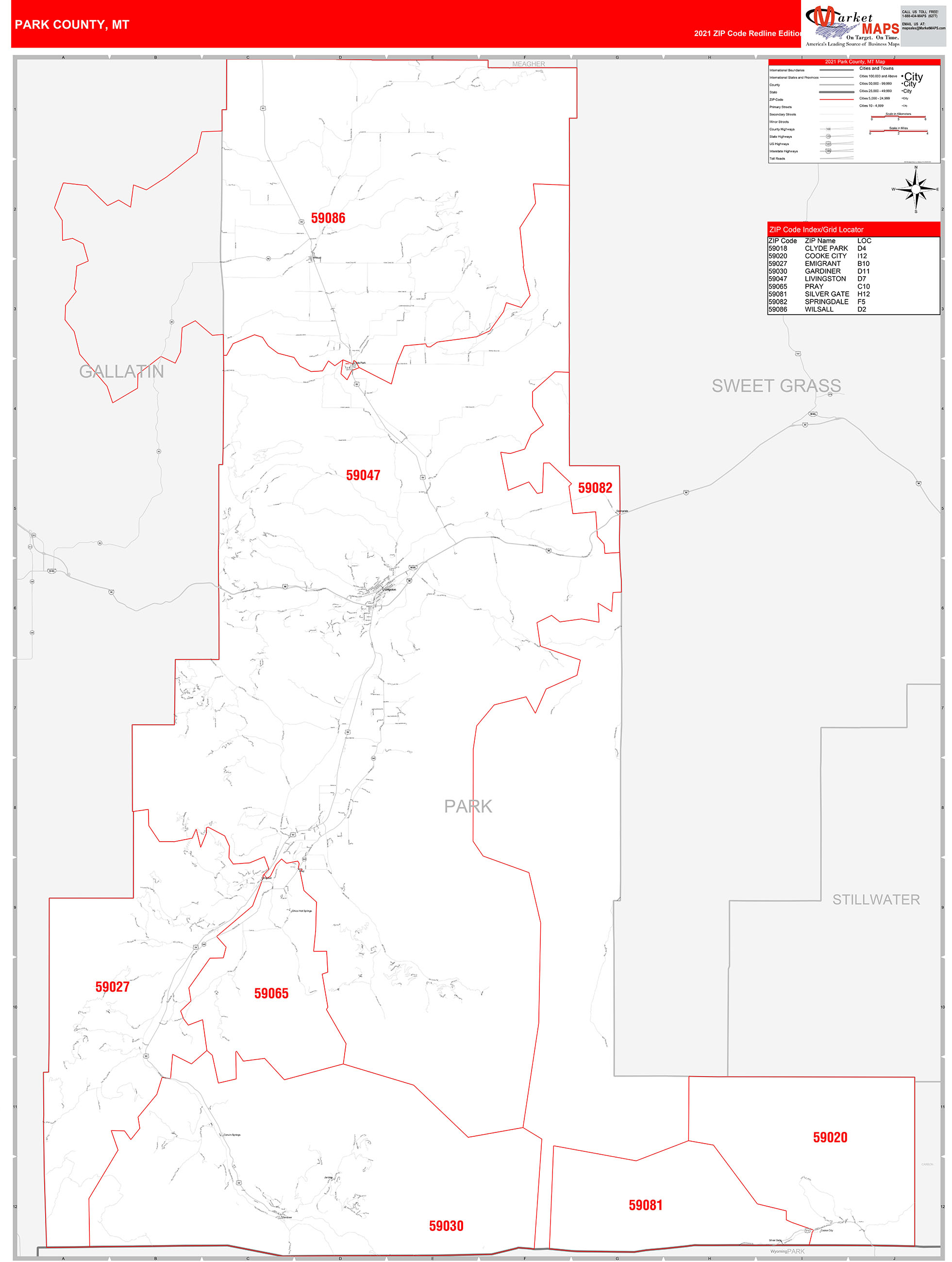 Park County, MT Zip Code Wall Map Red Line Style by MarketMAPS MapSales