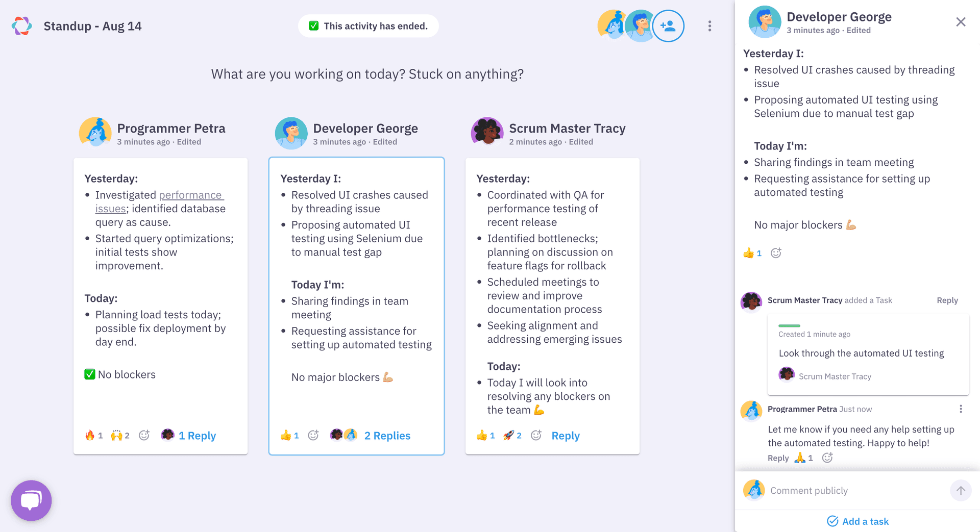 We created a comparison of the best (free) slack standup bots for 2024 to help you choose the right one for your needs and team. Improve your team’s performance by running asynchronous meetings.