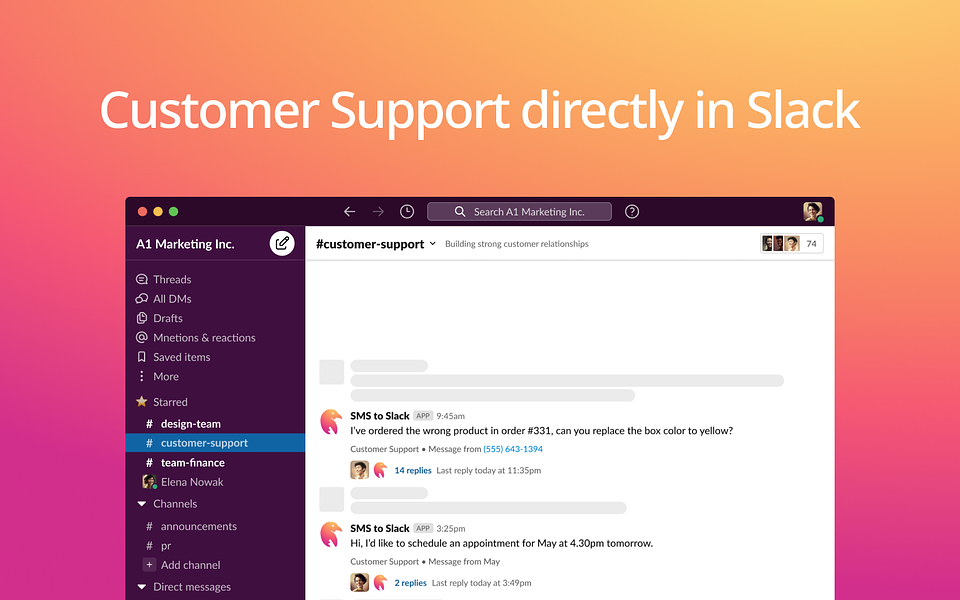Send and receive whatsapp text messages, pictures, videos, audio, gifs, and documents all in your slack workspace. A slack sms integration lets you view, reply, and send text messages from a preferred slack channel. Create phone numbers with custom area prefixes, and start messaging with your customers in under 10 minutes. Set up in minutes, no credit card required. Sms.