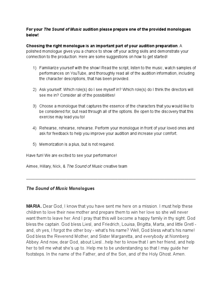 The sound of music monologues maria. Dear god, i know that you have sent me here on a mission. You will be reciting this, not singing it. You may choose any of the monologues below to recite during your audition. I must help these children to love their. Please be prepared to read one of the following monologues. They do not need to be memorized. They are being given to you now.