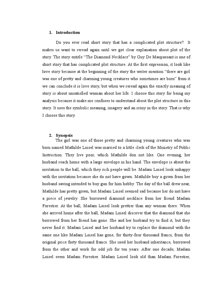 The main message of “the. These papers were written primarily by students and provide critical analysis of the necklace by guy de maupassant. They help identify that the story takes place in france, namely paris. The necklace in the short story represents a better life for mathilde and is a symbol of greed and false status. As for the historical epoch, it is the end of the 19th.