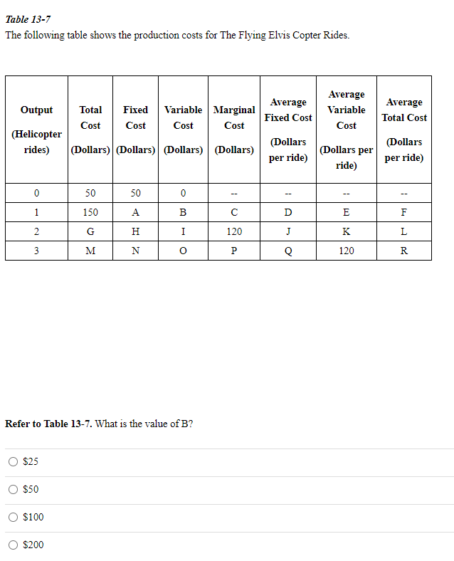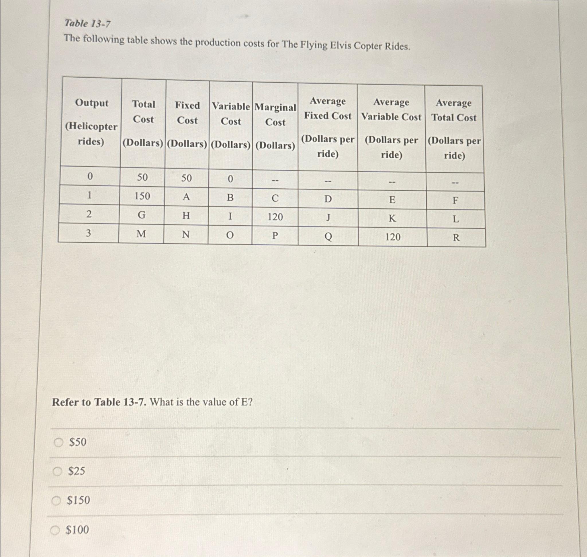The Flying Elvis Copter Rides - What is the value of d?. In this case, the output is 1 helicopter ride. Marginal cost is the cost of producing one more. The following table shows the production costs for the flying elvis copter rides. What is the value of d? Output (helicopter rides) total cost (dollars) fixed cost (dollars). From the table, we know that the total cost (tc) when the output is 1 ride is $150 and the fixed cost. The following table shows the production costs for the flying elvis copter rides.