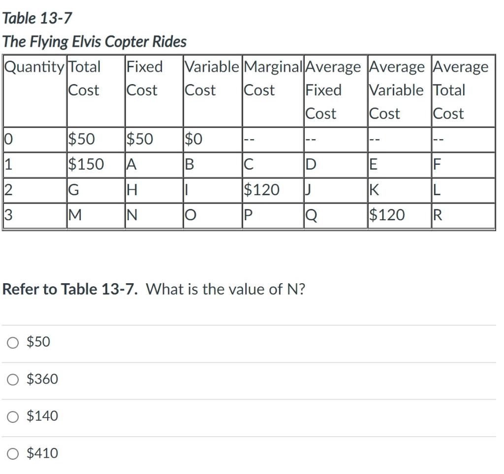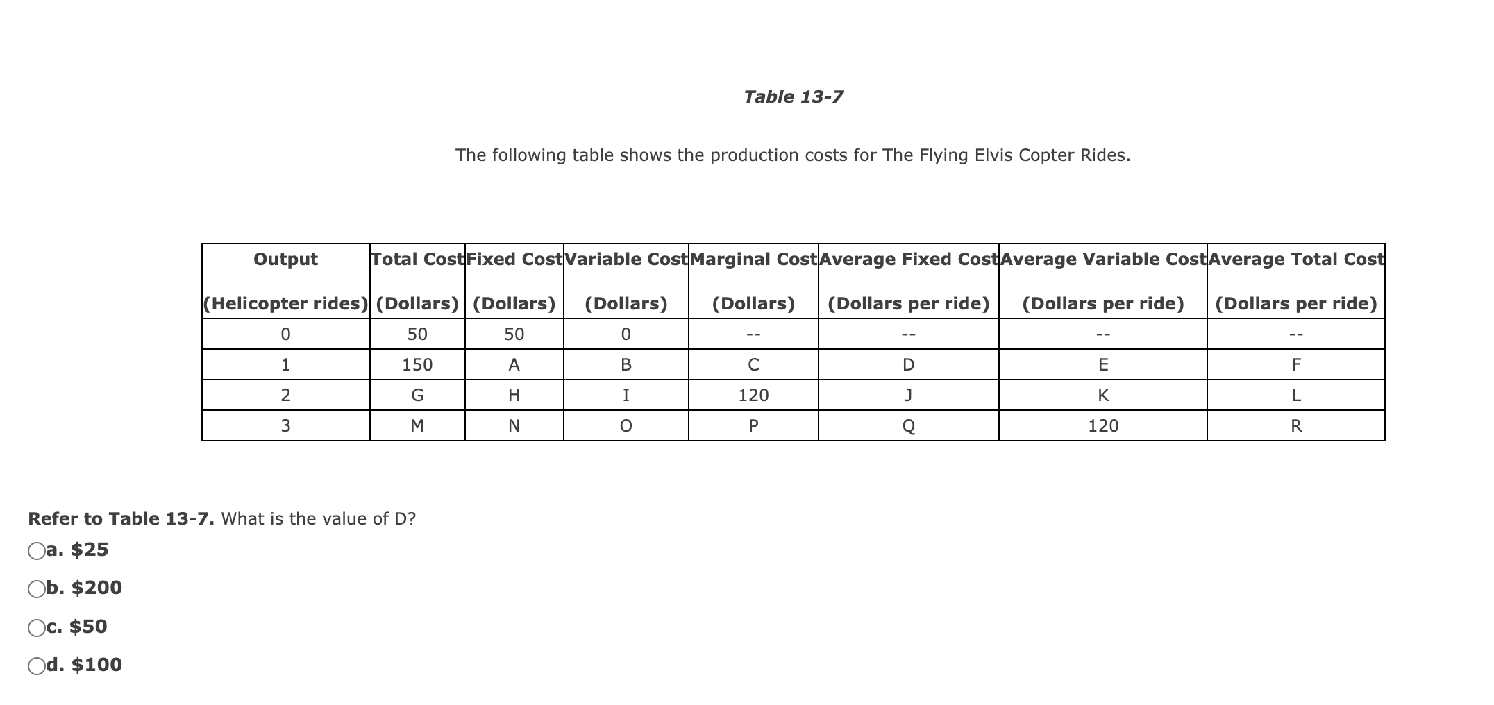 From the table, we know that the total cost (tc) when the output is 1 ride is $150 and the fixed cost. In this case, the output is 1 helicopter ride. What is the value of d? The following table shows the production costs for the flying elvis copter rides. What is the value of d?. The following table shows the production costs for the flying elvis copter rides. Marginal cost is the cost of producing one more. Output (helicopter rides) total cost (dollars) fixed cost (dollars).