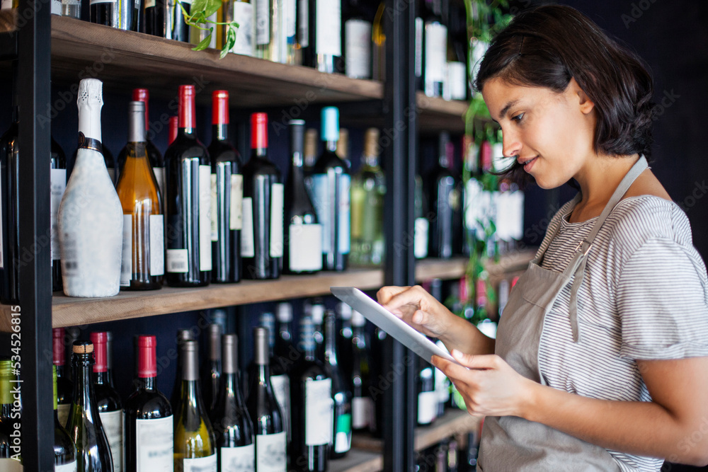 Wine shop owner setting up online store on digital tablet Stock Photo