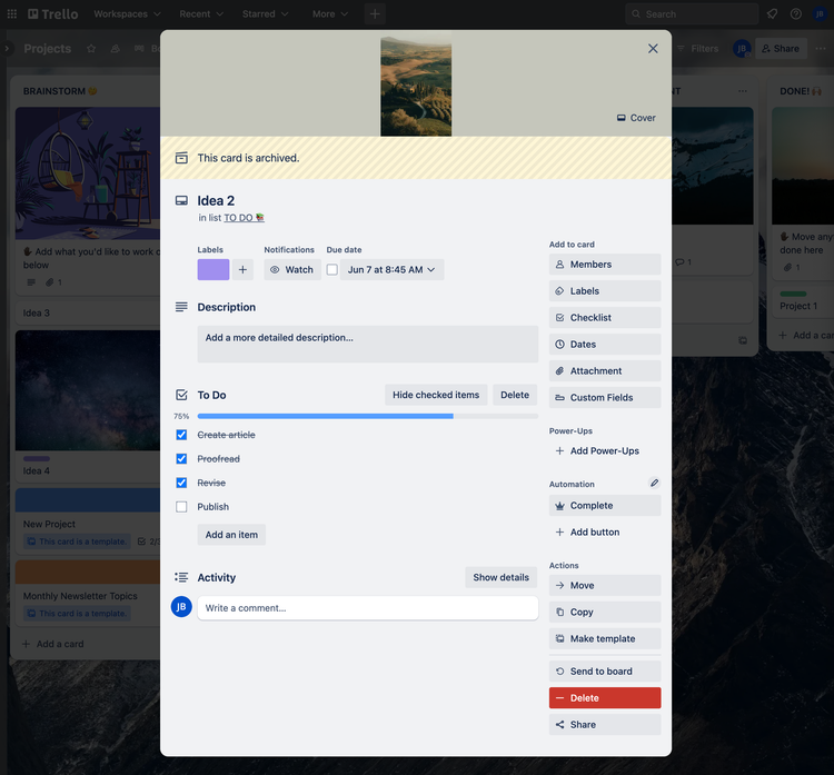 Trello How To Delete A Card - To delete a card in trello, you must first archive it and then confirm the deletion. Trello is a popular project and task management tool, and cards are. Archiving a card does not delete it permanently, but removes it. Deleting cards is a quick and easy way to keep your trello board. This wikihow teaches you how to remove a card in trello. In this article, we will explain step by step how delete a card in trello, as well as the differences between archiving and deleting. To delete a card, you must first archive it. Click the card to open it, then choose archive from the bottom right.