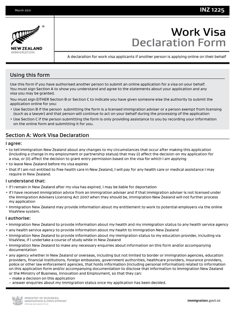 INZ 1225 Work Visa Declaration Form PDF Travel Visa Cultural