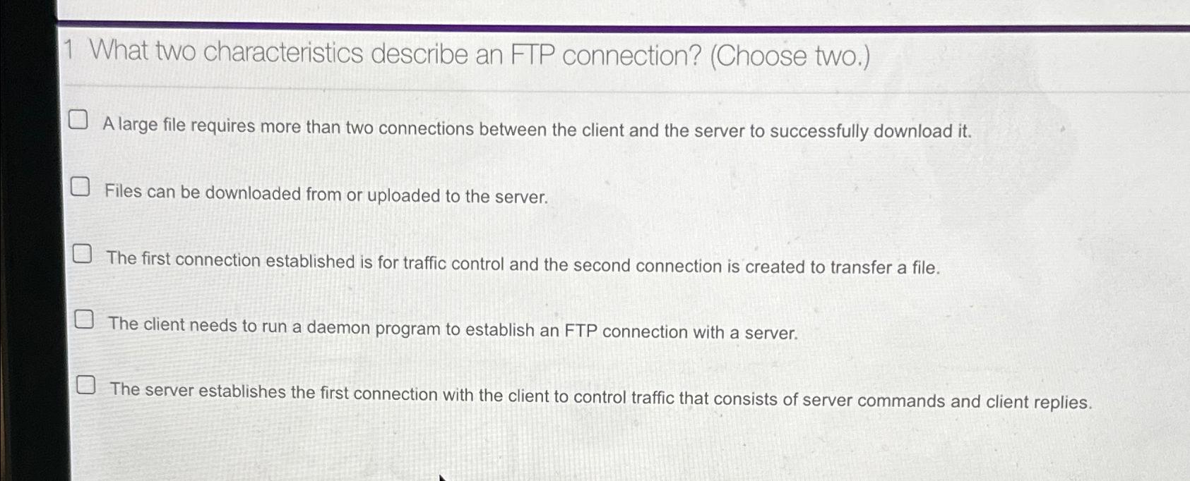 What Two Characteristics Describe An Ftp Connection - To transfer files, ftp requires two connections between the client and the server: Ftp operates in two modes: In active mode, the client initiates a connection to the. Study with quizlet and memorize flashcards containing terms like what two characteristics describe an ftp connection? One for commands and replies and another for the.