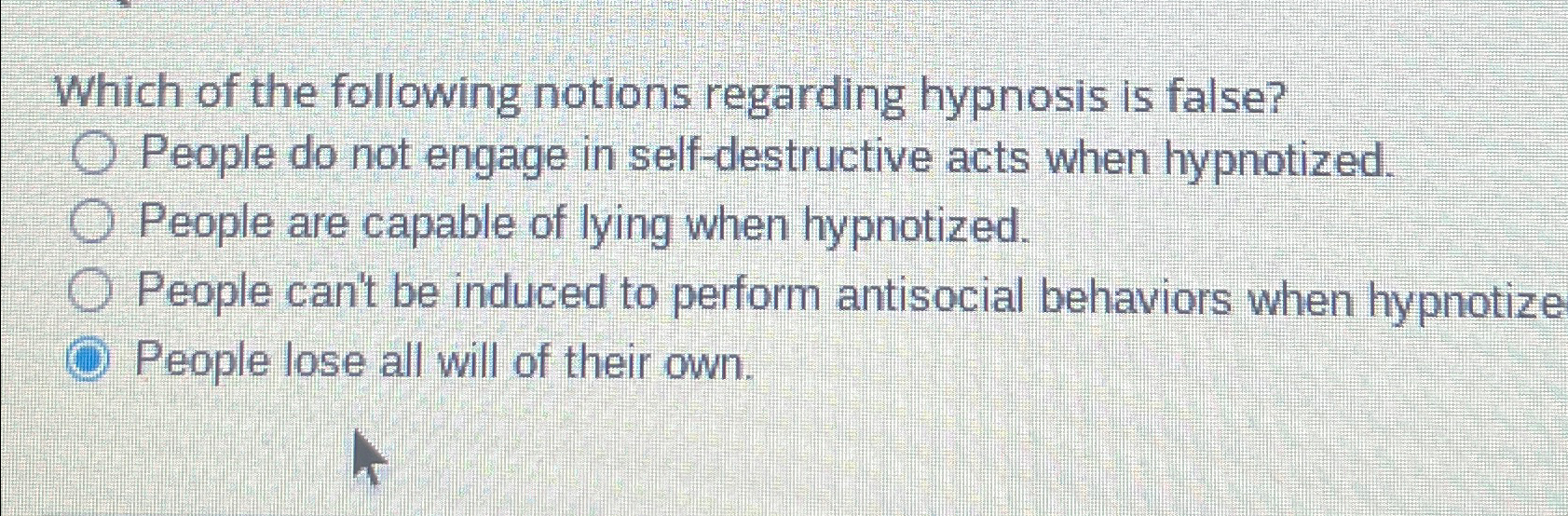 Which of the following is true of. Contrary to popular public opinion regarding hypnosis, people can: People cannot be hypnotized against their will. For example, during hypnosis, a person can still choose to lie or withhold information. Which of the following notions regarding hypnosis is true? Experience highly enhanced memory for situational details. From understanding its historical context to exploring its applications and benefits, we provide a clear and concise overview of the. B) people cannot be hypnotized. People cannot be hypnotized against their will. Which of the following notions regarding hypnosis is true?
