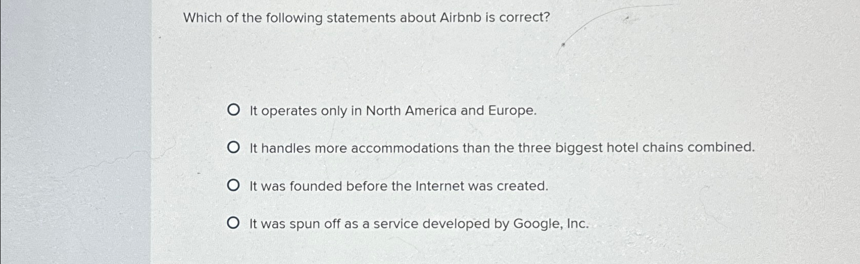 It was founded before the internet was created. The correct statement about airbnb is: Which of the following statements about airbnb is correct? Which of the following statements about airbnb is correct? The correct statement about airbnb is that it accommodates more guests than the three largest hotel chains combined. The correct statement about airbnb is: Which of the following statements about airbnb is correct? Here’s the best way to solve it. It operates only in north america and europe. It handles more accommodations than the three biggest hotel chains combined.