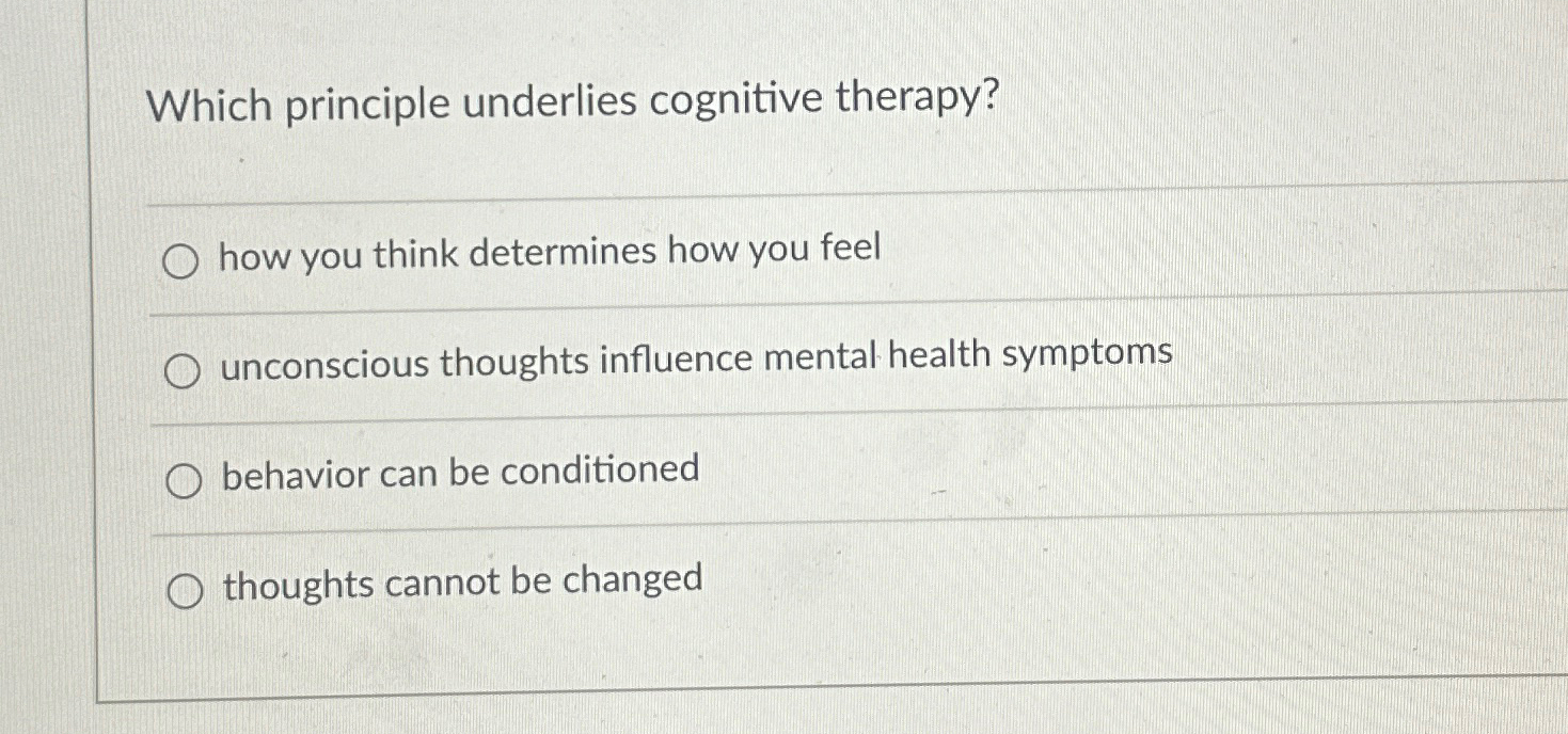 The principle that underlies cognitive therapy is how you think determines how you feel. Cognitive therapy, also known as cognitive. Which principle underlies cognitive therapy? How you think determines how. Which principle underlies cognitive therapy?